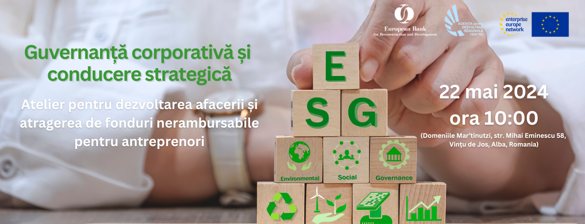 Atelier pentru dezvoltarea afacerilor! Eveniment organizat de Banca Europeană pentru Reconstrucție și Dezvoltare în parteneriat cu Agenția pentru Dezvoltare Regională Centru Banca Europeană pentru Reconstrucție și Dezvoltare (BERD) organizează în parteneriat cu Agenția pentru Dezvoltare Regională Centru un atelier dedicat dezvoltării afacerilor și atragerii de fonduri nerambursabile. Evenimentul își propune să aducă în atenția […]