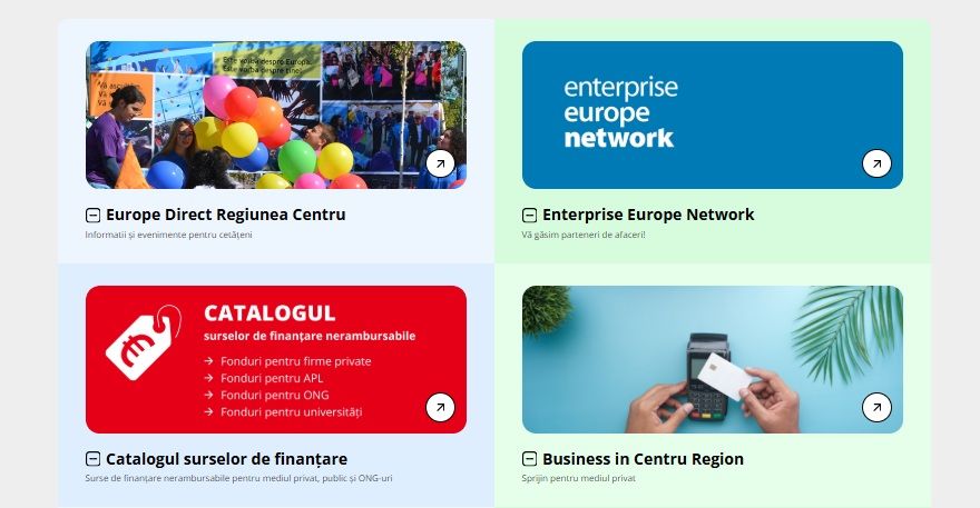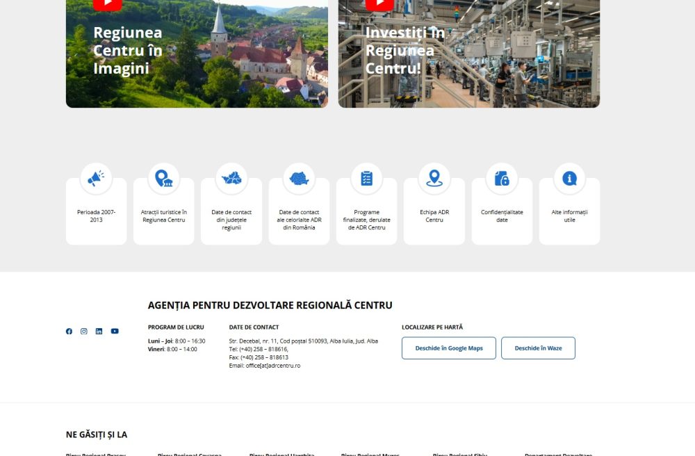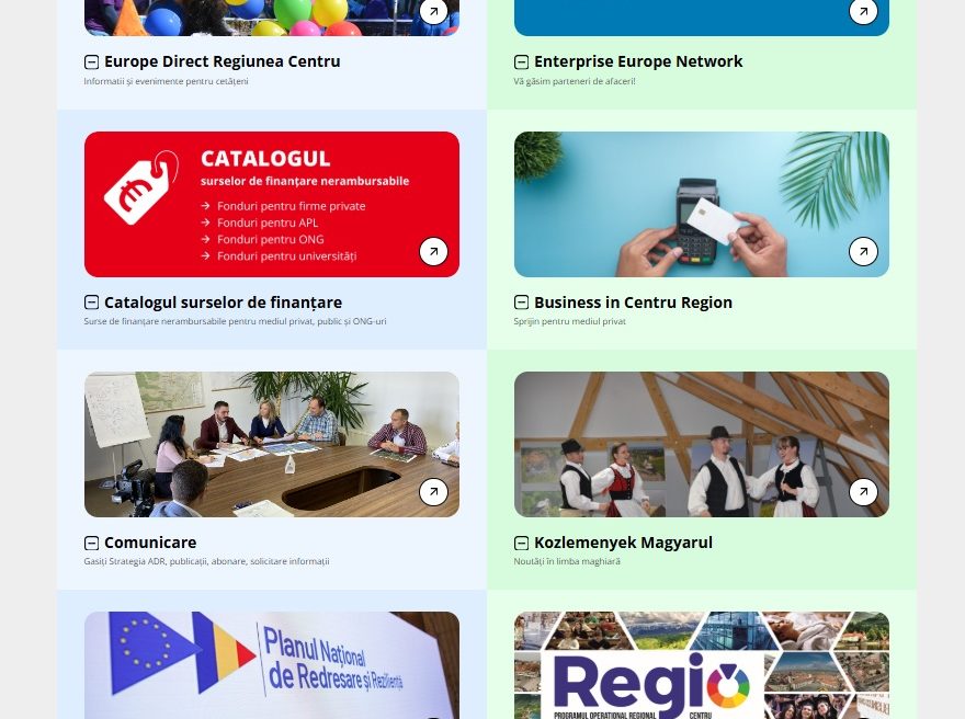 În același mod, crește accesibilitatea și vizibilitatea și pentru celelalte secțiuni care reflectă activități derulate în cadrul ADR Centru: Catalogul Surselor de Finanțare, Centrul Europe Direct, Enterprise Europe Network, Secțiunea în limba maghiară, pagina dedicată pentru Business in Centru Region, informații despre PNRR în Regiunea Centru, sau detalii despre Programul Operațional Regional 2014–2020.