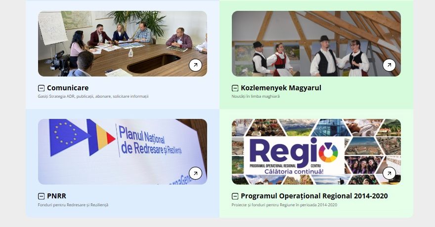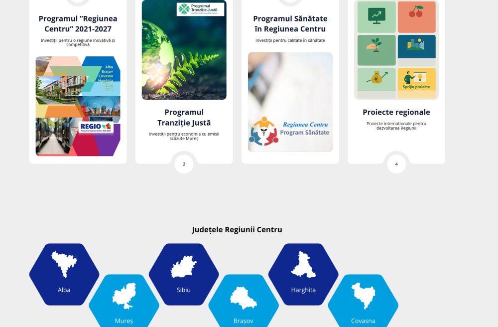 Secțiunile sau paginile web independente dedicate programelor pentru care ADR Centru este Autoritate de Management, sau Organism Intermediar: Programul „Regiunea Centru 2021–2027”, Programul Tranziție Justă (implementat în județul Mureș), Programul Sănătate (prioritățile 1, 2, 3, 4 și 7), precum și secțiunea dedicată proiectelor regionale în care ADR Centru este parte, sunt mult mai clar evidențiate și mai accesibile, la „doar un click distanță”, prin accesarea widget-ului dedicat.