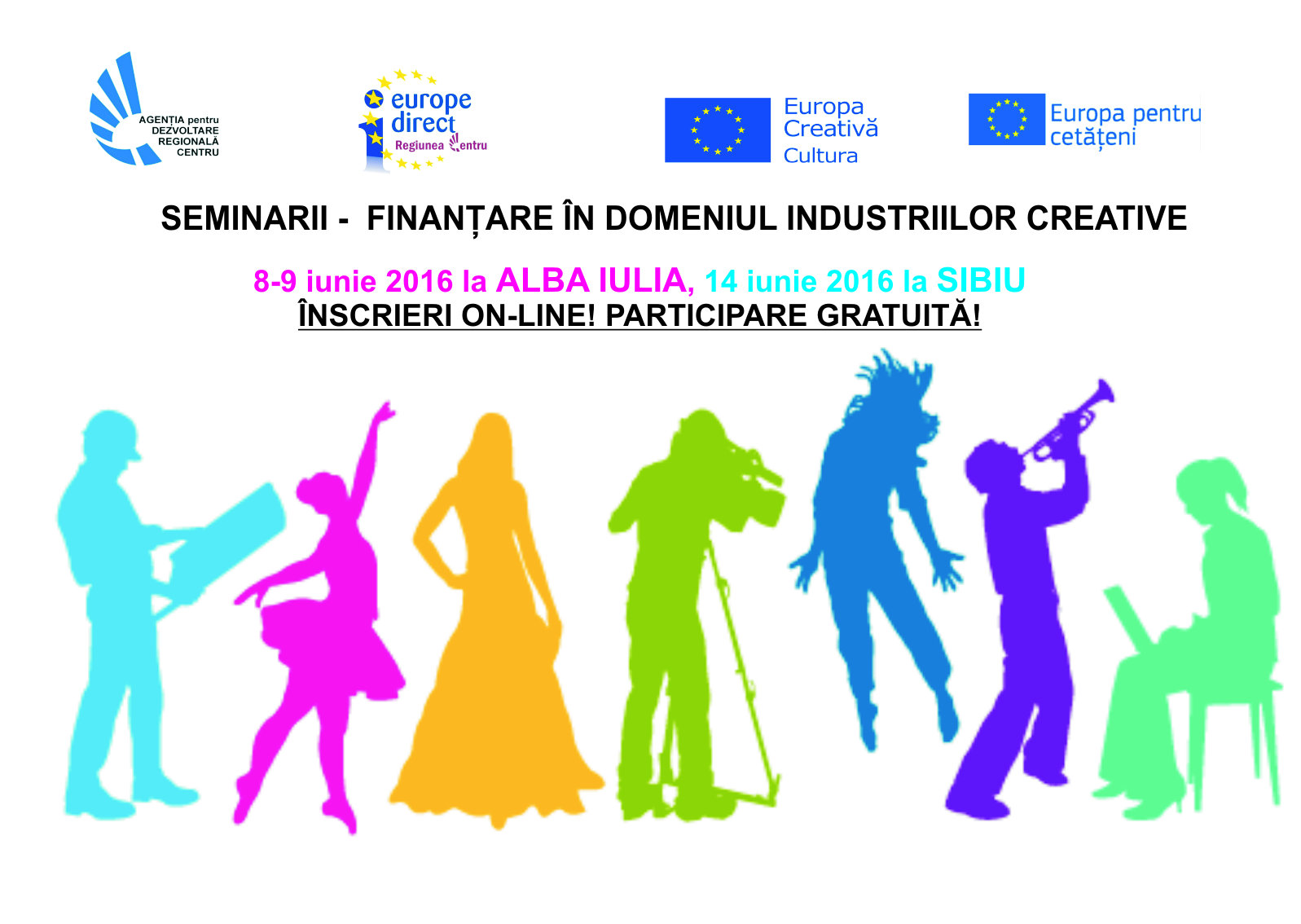 Agenția pentru Dezvoltare Regională Centru, prin Centrul de Informare Europe Direct Regiunea Centru, organizează două sesiuni de informare și ateliere de scriere proiecte pentru finanțare nerambursabilă în domeniul industriilor creative. Sesiunile vor avea loc în perioada 8-9 iunie 2016 la Alba Iulia, respectiv în data de 14 iunie 2016 la Sibiu, în cadrul Bursei de spectacole din Festivalul Internațional de Teatru. Aceste evenimente sunt organizate împreună cu Biroul Europa Creativă România – Subprogramul Cul-tura și Punctul Europa pentru Cetățeni România din cadrul Ministerul Culturii, cu sprijinul Primăriei Sibiu și al Teatrului Național ”Radu Stanca” Sibiu pentru evenimentul din 14 iunie.