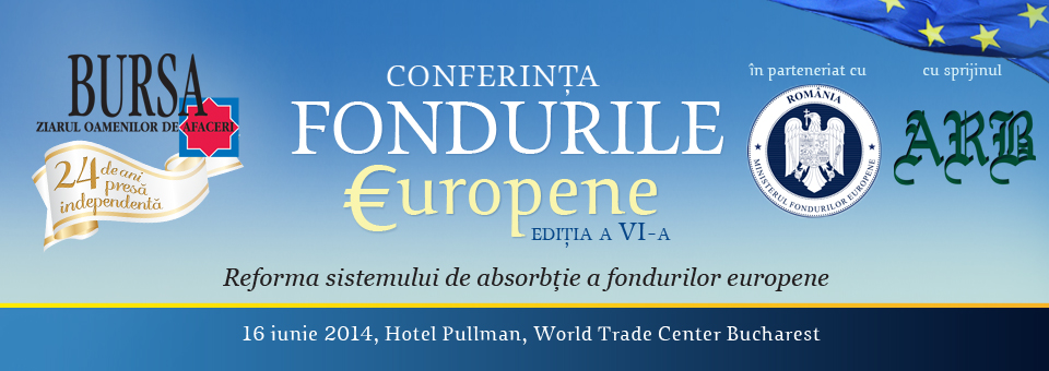Publicat in: 28 mai, 2014Grupul de Presa BURSA, in parteneriat cu Ministerul Fondurilor Europene si cu sprijinul Asociatiei Romane a Bancilor, organizeaza a VI-a editie a Conferintei Fondurile Europene, sub genericul “Reforma sistemului de absorbtie a fondurilor europene”, in data de 16 iunie 2014, incepand cu orele 9.30, la Hotel Pullman, World Trade Center Bucharest, sala New York.