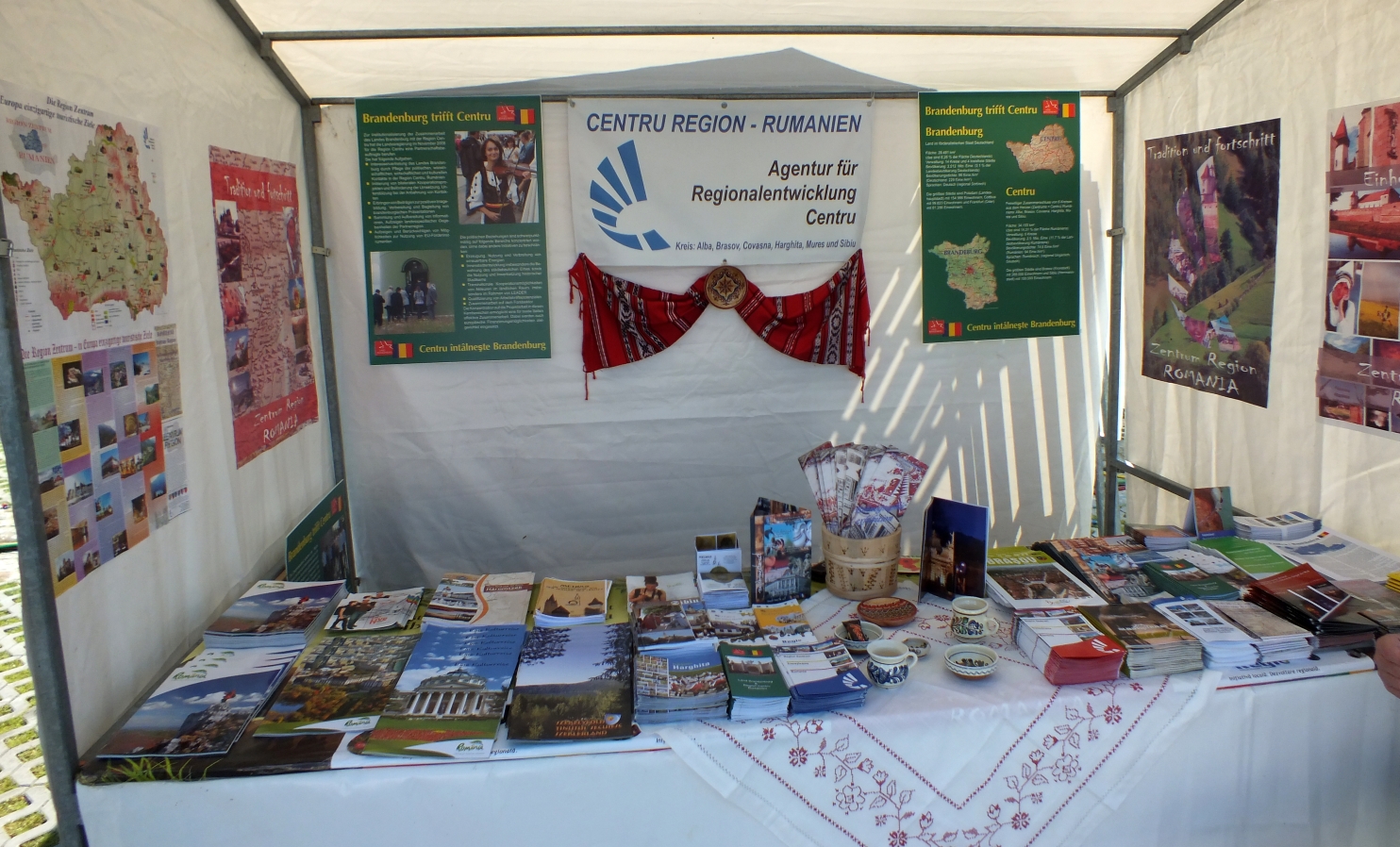 Timp de doua zile, 1 si 2 septembrie 2012, Agentia pentru Dezvoltare Regionala Centru a prezentat, pentru mii de locuitori din Landul Brandenburg – Germania, atractiile turistice si potentialul socio-economic al Regiunii Centru. Informatiile au fost oferite germanilor in cadrul evenimentului ”Zilele Brandenburg 2012”, desfasurat in localitatea Lübbenau/Spreewald. Regiunea Centru, care se afla la a doua participare de acest fel, a beneficiat de un stand gazduit in sectiunea speciala dedicata partene-rilor landului german, langa standurile a trei regiuni poloneze si in imediata apropiere a centrului de presa. Delegatia Cancelariei de Stat, condusa de Ministrul Presedinte al Landului Brandenburg, dom-nul Matthias Platzeck, a vizitat aceste standuri in cursul zilei de sambata, 1 septembrie 2012.