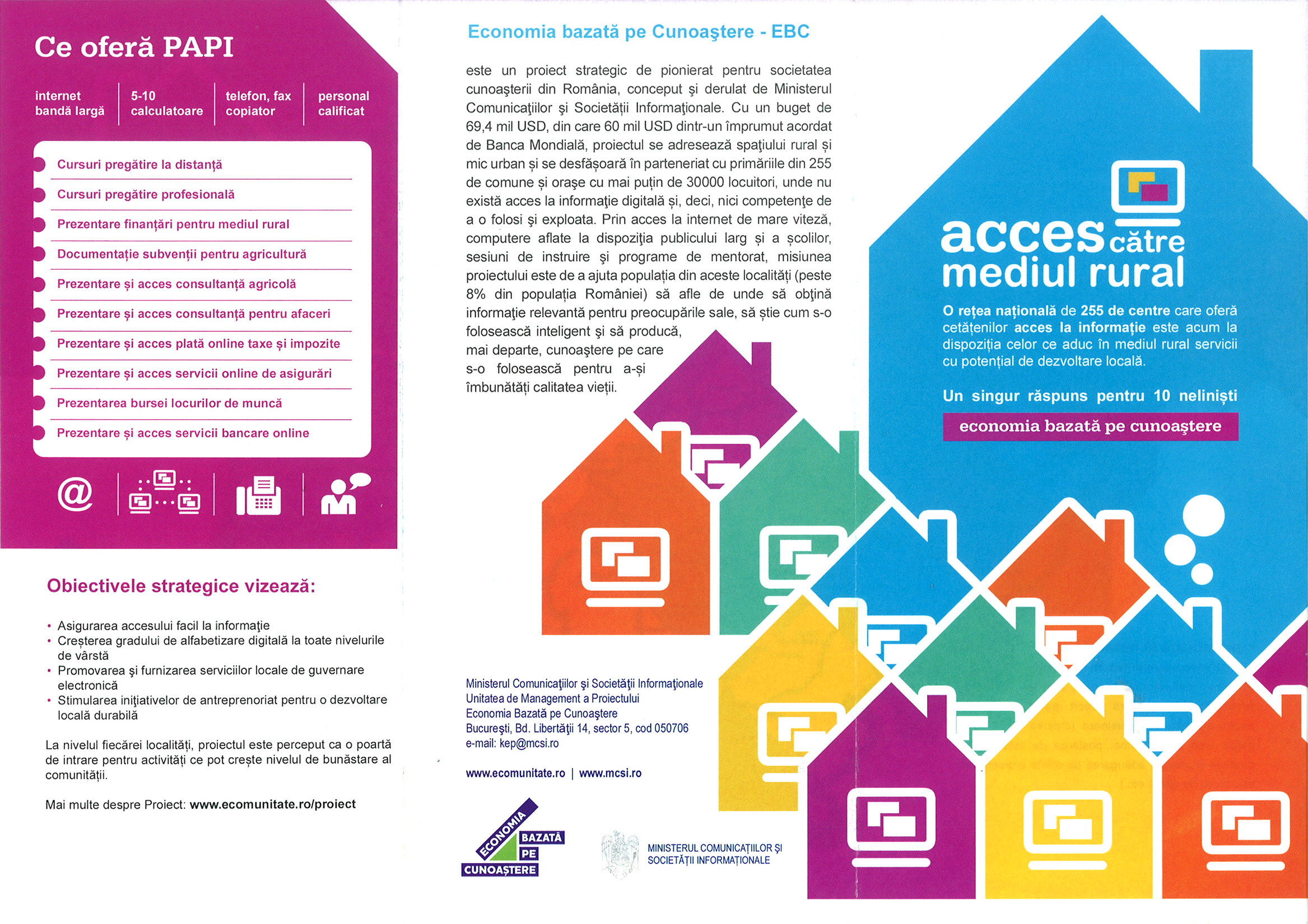 Publicat in: 27 februarie, 2010Ministerul Comunicatiilor si Societatii Informationale a dezvoltat o retea rurala de Puncte de Acces Public la Informatie (PAPI) echipate cu internetul de banda larga, in 255 de comune si orase mici distribuite uniform pe tot teritoriul Romaniei. Prin intermediul acestora este facilitat accesul la diferite servicii specializate pentru o populatie de cca. 1,8 milioane de locuitori.