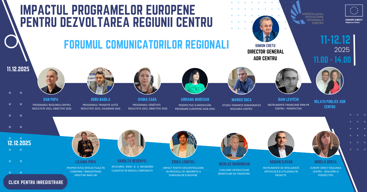 Publicat in: 09 decembrie, 2025Invitație participare FORUMUL COMUNICATORILOR REGIONALI Europe Direct Regiunea Centru, în colaborare cu structura gazdă – Agenția pentru Dezvoltare Regională Centru, vă invită să participați la evenimentul ,,Forumul Comunicatorilor”, un eveniment regional care se va desfășura online, pe parcursul a două zile, în datele de 11 și 12 decembrie 2025, începând cu ora 11:00. Pe parcursul […]