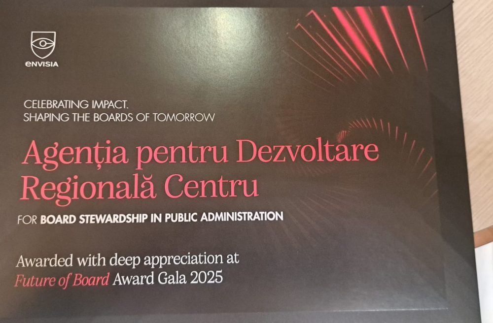 Agenția pentru Dezvoltare Regională Centru a primit, în cadrul Galei „Future of Boards” 2025, organizată de Envisia, distincția „Responsabilitate în Administrația Publică”, prin care sunt recunoscute eforturile și rezultatele pe care instituția le-a obținut în activitatea de susținere fermă a administrațiilor locale, mediului de afaceri, universităților și societății civile, în demersul de edificare a unei regiuni mai competitive și mai atractive.